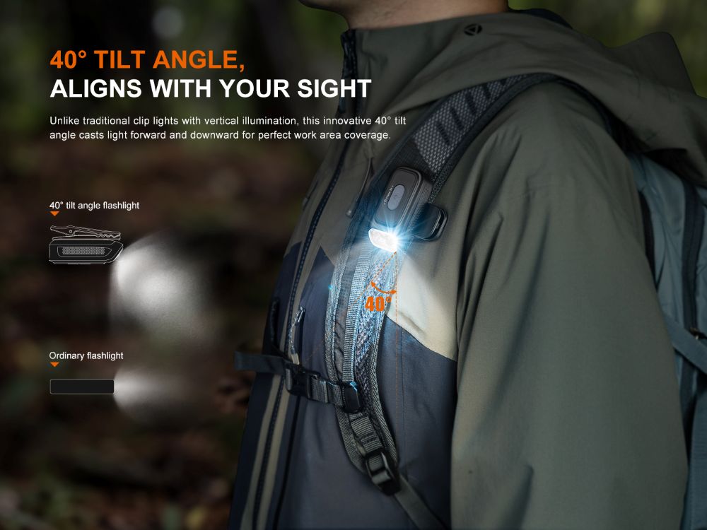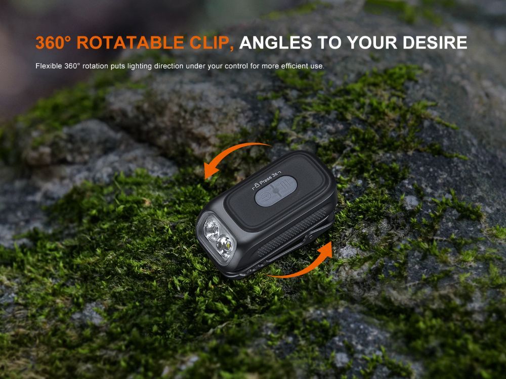 - 360° въртяща се скоба + ъгъл на светлинния лъч 40°, поддържаща различни начини на носене и употреба (в джобове, шапки, раници и др.), оставяйки ръцете ви свободни.