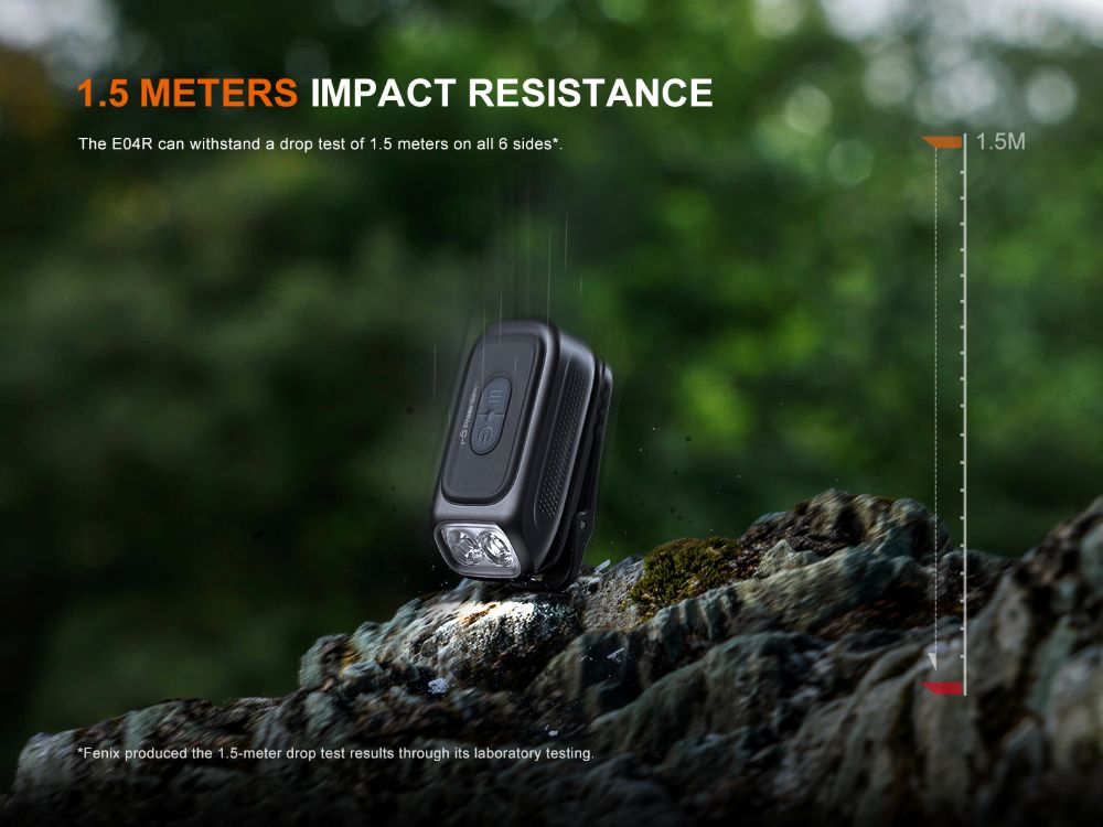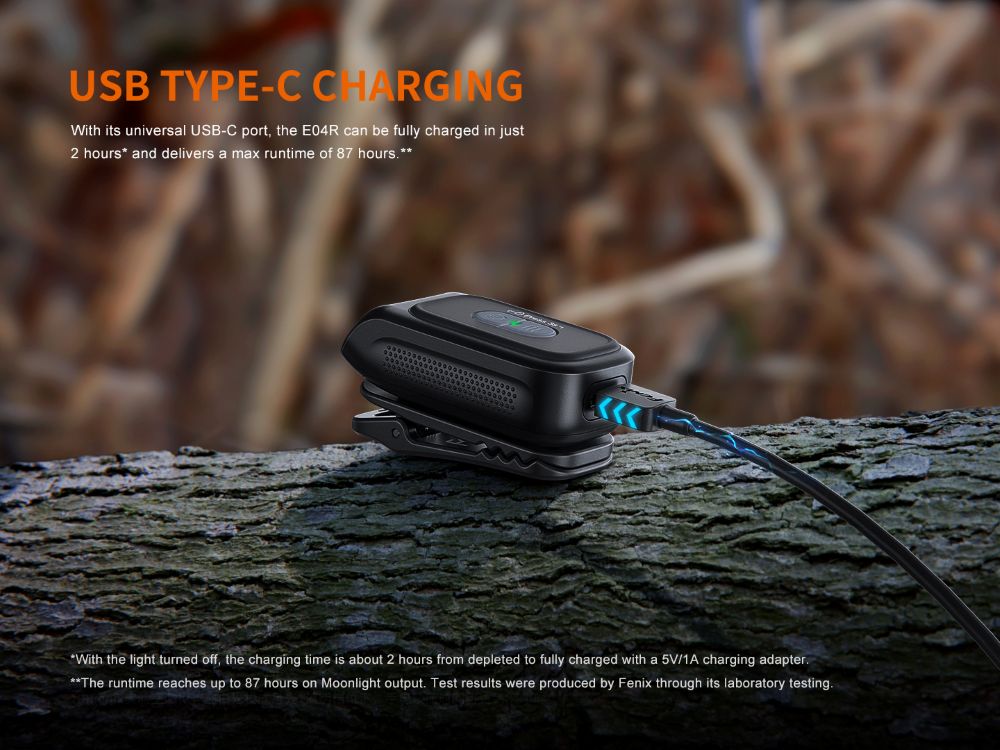 Фенер Fenix E04R Clip On е лек, многофункционален фенер за ежедневно носене (EDC), проектиран за удобна употреба без ръце. Този фенер с клипс разполага с въртяща се на 360° скоба, която лесно се закрепва към джоб, раница или шапка. Светодиодите са разположени под уникален ъгъл от 40°, което позволява на светлината да осветява едновременно както земята, така и пътя пред вас.