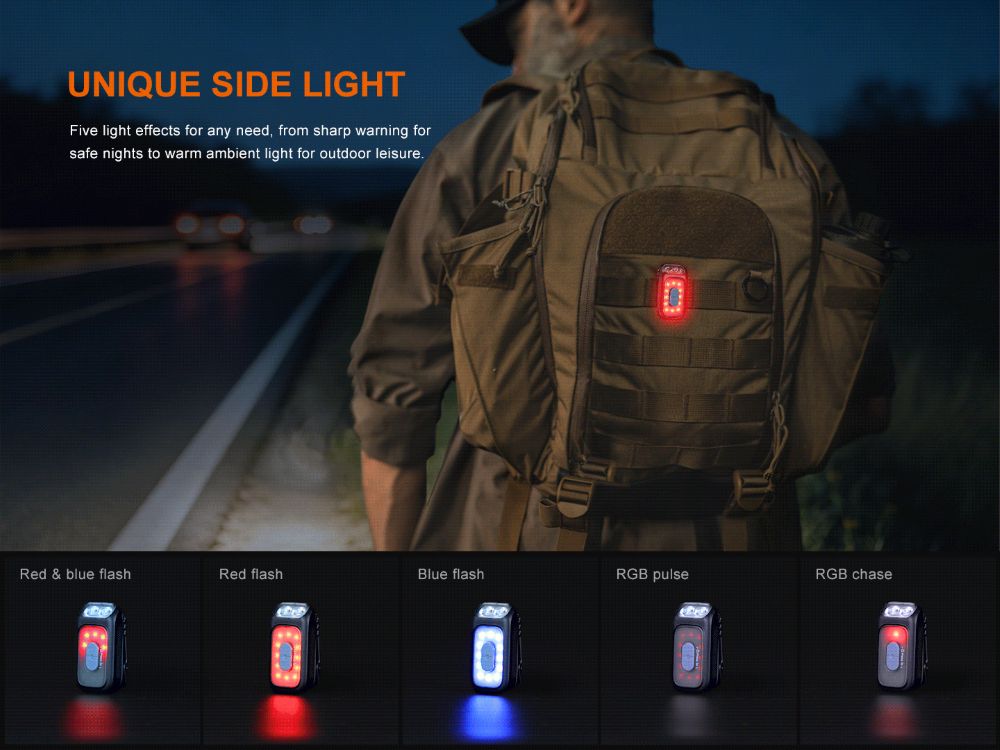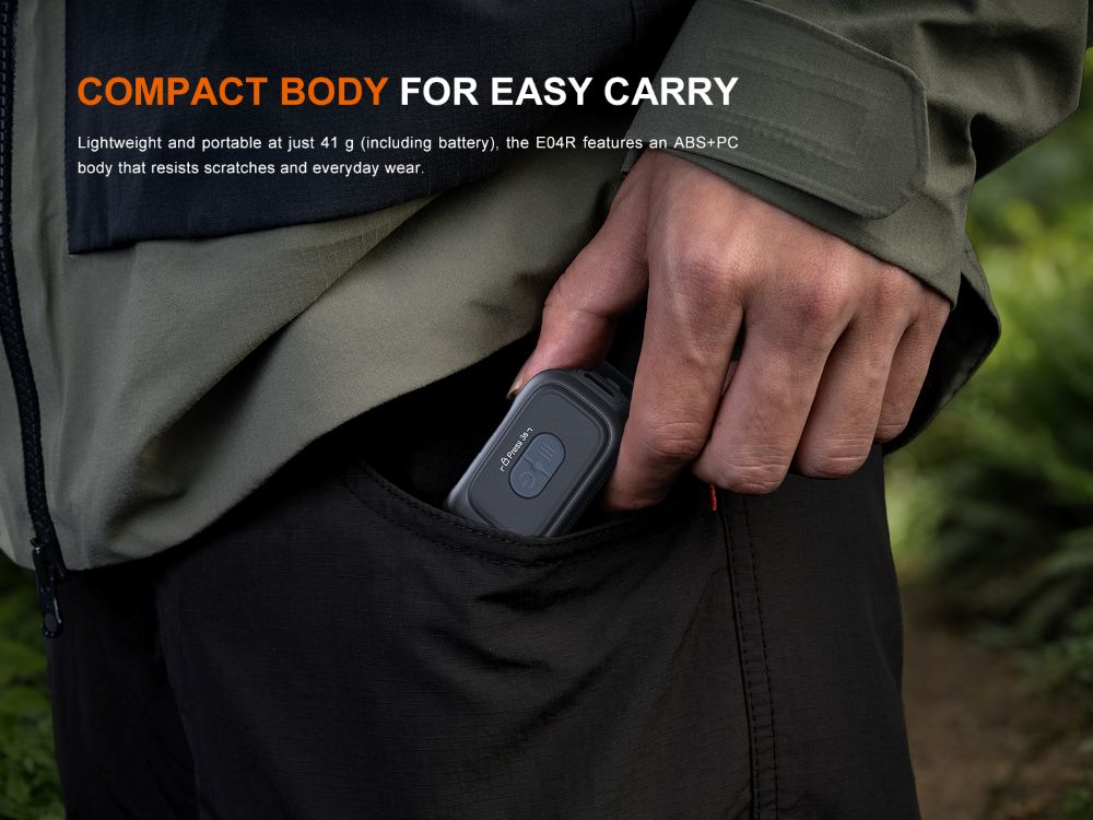 С общо 11 режима, E04R предлага невероятна гъвкавост в миниатюрен корпус. Тя разполага както с насочена напред бяла и червена светлина, така и с пет цветни режима „Scene“ на страничното пръстеновидно осветление за безопасност и сигнализация. С дължина само 5,8 см, тя осигурява мощност от 300 лумена и се зарежда бързо чрез вградения USB Type-C порт.