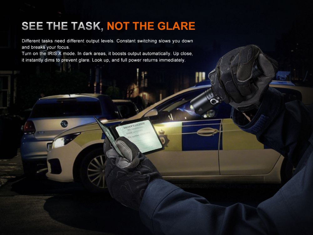 Презареждаемият тактически фенер Fenix TK15R предефинира интелигентното осветление с представянето на технологията IRIS X. Проектиран за рискови ситуации като спасителни операции (SAR) и правоприлагане, този фенер разполага с вграден сензор за осветеност, който автоматично регулира яркостта. Чрез засичане на светлината, отразена обратно към потребителя, TK15R незабавно регулира мощността си от мощни 2000 лумена за сканиране на далечни разстояния до 30 лумена за задачи отблизо. Независимо дали преминавате от далечна гориста местност към проверка на лична карта, системата се настройва автоматично, елиминирайки необходимостта от ръчно превключване между нивата на яркост.