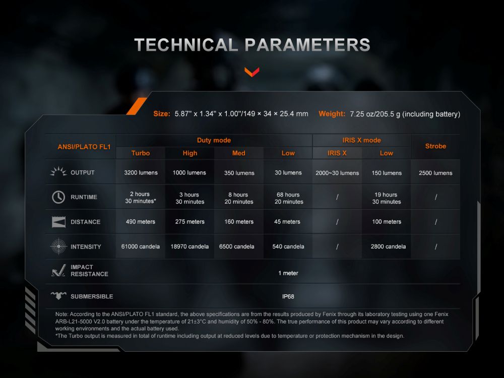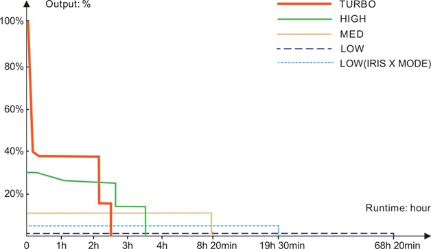 - Режими на осветяване: 7 режима на осветление, включително 4 нива на режим „Duty“, две нива на режим „IRIS X“ и режим „Strobe“