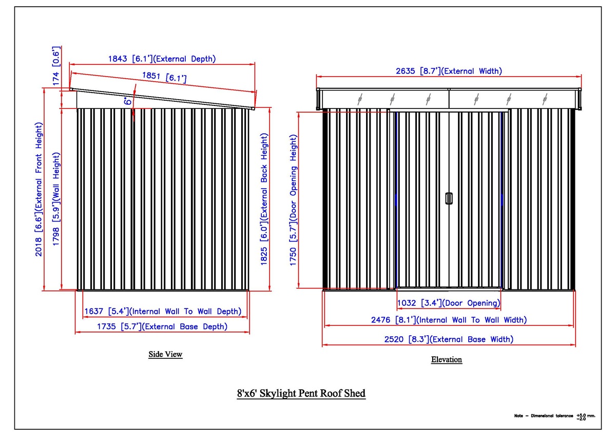 Таблица със спецификации Pent Roof 8×6 w/ Skylight – Duramax