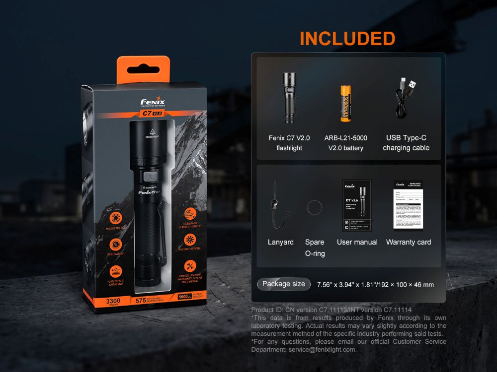 Акумулаторният фенер Fenix C7 V2.0 е най-добрият високопроизводителен инструмент за онези, които предпочитат видимостта на далечно разстояние пред компактността. Като специализиран модел за далечно осветяване в обновената серия C7, тази версия излъчва светлинния си лъч с максимална мощност от 3300 лумена на невероятното разстояние от 575 метра. Тази фенерче осигурява истинско прожекторно изживяване, което е идеално за операции по търсене, мащабна индустриална работа или проучвания на открито. Докато нейният събрат, C7 PRO, се фокусира върху максимален обхват и яркост, C7 V2.0 е проектиран за прецизност и разстояние, предлагайки професионална производителност.